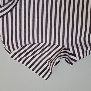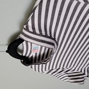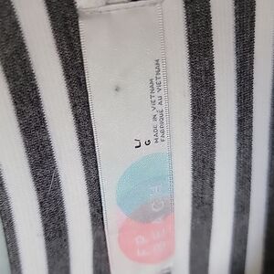 White with a grayish color stripe. Short sleeves. Does stretch. Great condition. Casual, summer, spring, sailor chic, nautical, beach, lounge, poolside vacation, resort, academia, goth, travel,cute,girly