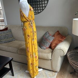 Excellent condition. Beautiful drape and flow. Adjustable waist with cute contrasting ties. Adjustable neck with same contrasting tie as waist. Lined. SZ Tag says S although measurements with jumpsuit completely untied looks like it would fit a medium as well. Please go by measurements approximate laying flat in pictures provided. Long. Please see all thirteen photos and one video provided. Thank you for looking.