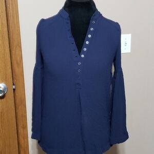 Dark blue tight in the bicep to a beautiful full bell sleeve half front button down mock collar navy blue rayon free people top size extra small