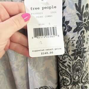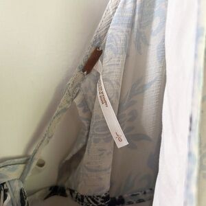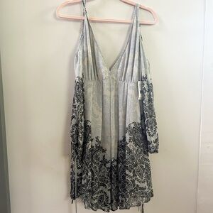 Free people chiffon blue patterned dress. Has open shoulders. Mini style. Size large. Perfect condition