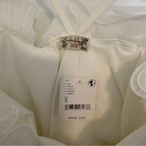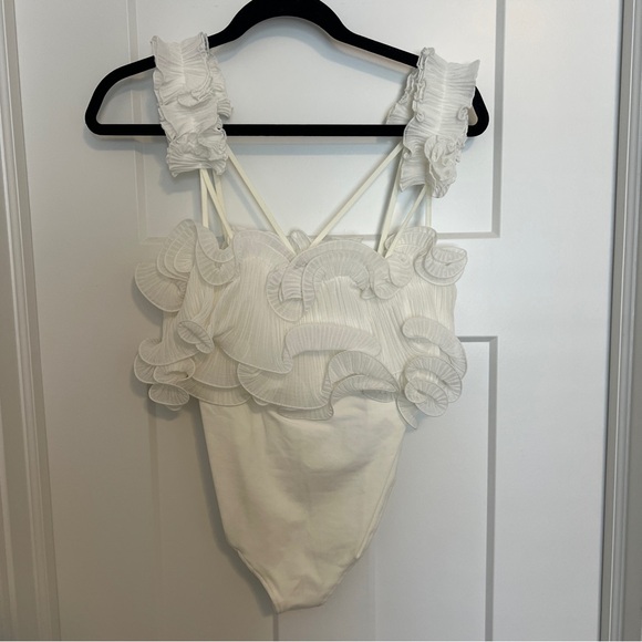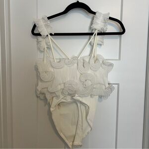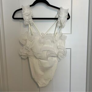 This elegant white bodysuit features delicate ruffles for a chic and feminine look. Perfect for layering or wearing on its own, it offers both style and comfort.