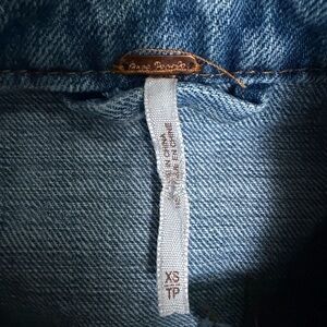Chic double-breasted jean jacket. Features brass button details. Ideal for casual wear.