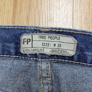 Free People vintage distressed denin cutoff shorts with beige crochet lace trim.
