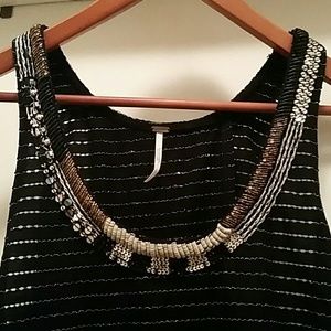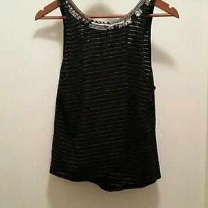 Black with silver stripes. Silver, gold and bronze embellishments. Peek a boo back . Excellent condition. Not true to size . Fits small to medium but marked large . Never worn like new