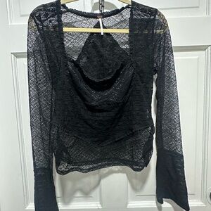 free people, sheer lace top, black lace blouse, cowl neck, bell sleeve top, boho chic, gothic romance, festival fashion, romantic lace, layering top, semi-sheer blouse, black mesh top, date night style, free people lace, edgy boho, drape front blouse, sheer long sleeve, lace festival top, gothic bohemian, sheer cowl neck