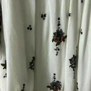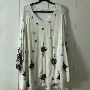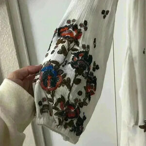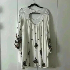This is a long sleeve, slightly open back dress with embroidering all over Boho style has pockets. No size tag fits size small