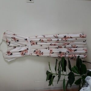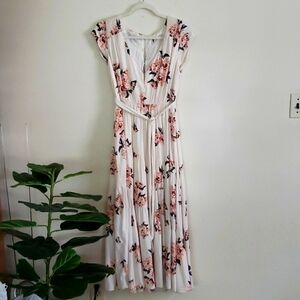 Free people floral cream pink boho midi maxi dress waist tie, cap sleeve, scoop neck, hook and eyes at chest, covered buttons up back, women's size 4.