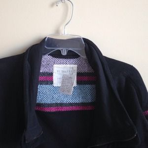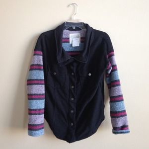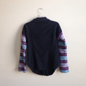 It is made of a cotton/poly she'll with hemp embroidered sleeves with different colors. I love this item! I would wear layered up. It's an XS small, but if you are a small like me you could wear it. So cute!! Negotiable! :) new with tags!