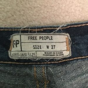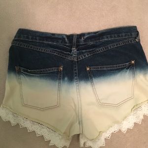 Free people distressed high rise two tone Jean shorts with scalloped white lace hem. Button front closure with zip fly. 2 pockets in front and 2 in back with belt loops. Worn once! In like new condition. 100% cotton! Perfect for summer.