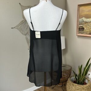 New with tags. Adjustable spaghetti straps on a straight neck sheer top. Lined chest. Side slits. Could wear out at night with jeans. SZ XS. Please confirm measurements appropriate laying flat in pictures as Poshmark does not accept returns for fit issues. Please scroll to see all eight photos
