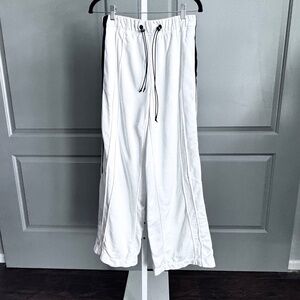 White with black side stripe and ties at the waist, fully adjustable. two side pockets.