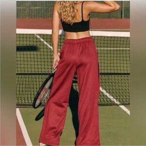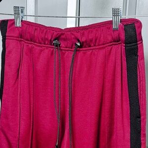 Dark red or burgundy with black side stripe and ties at the waist, fully adjustable. two side pockets.