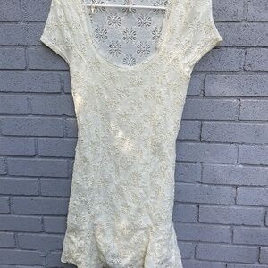 By the brand free people. Slight yellow / slightly off white. Vintage inspired mini boho dress. Women's small. Lace floral cutout style.perfect for a beach wedding or festival wear. 97% nylon & 3% spandex. Fitted. Great condition.