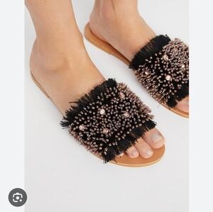 slip on sandal with iradescent beaded and fringe detail