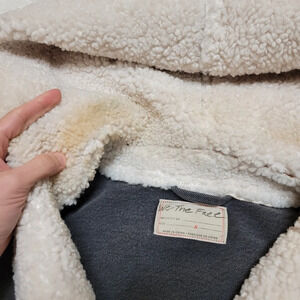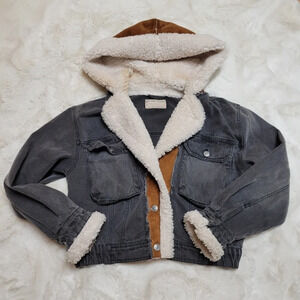 Free people perry hooded denim jacket in washed black sherpa trim size S