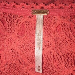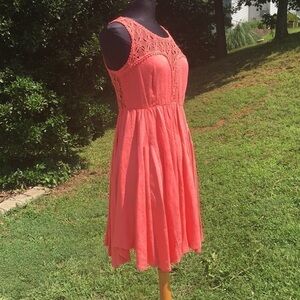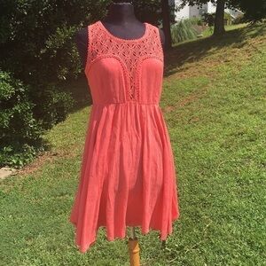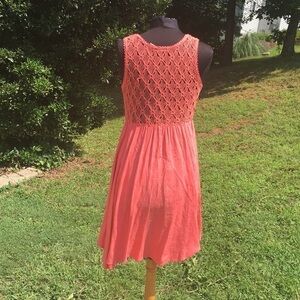 Beautiful coral pink free people boho dress with crocheted lace back, straps and at plunging Vneck. Size is M