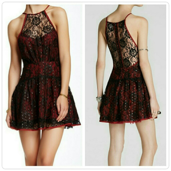 Free people wish upon a star mini dress with black lace overlay and rhinestones.