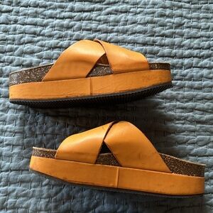 This is a fantastic pair of like new free people slide sandals in a mustard yellow. They are a size 39 or 8 1/2. I have only worn them one time.