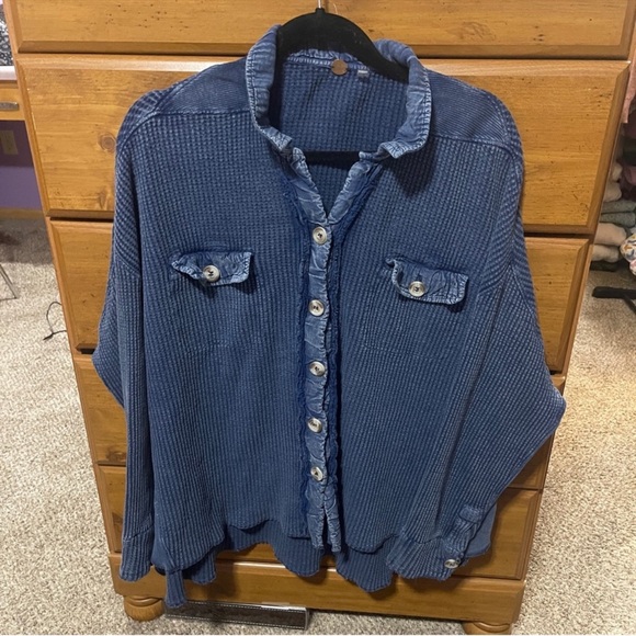 Stylish blue jacket with button-up front. Features two chest pockets. Perfect for layering.