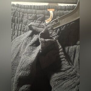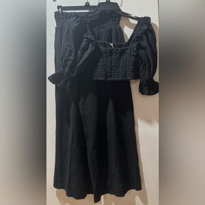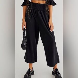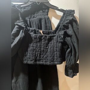 At Ease Set by Free-est in black. So effortless and occasion-ready, this special set from our free-est collection features a square-neck crop with exaggerated sleeves and coordinating wide-leg trousers for a perfect go-to outfit. Very very comfortable! *both top and bottom stretch out to about 22” Top: -Smocked bodice -Puffed three-quarter sleeves -Ruffle trim Pants: -Smocked waistband -Pull-on design -Relaxed fit