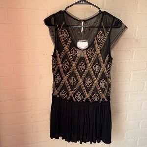 Free people shirt tulle raw pleated hem embroidered top beaded embroidery