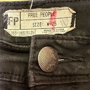 Free people size 25 mid rise black skinny jeans. In good condition no tears or stains noted does have writing on the label. Five pockets, button zipper fly, made of stretchy Cotton, rayon, spandex, and polyester blend. Inseam measures 27 inches