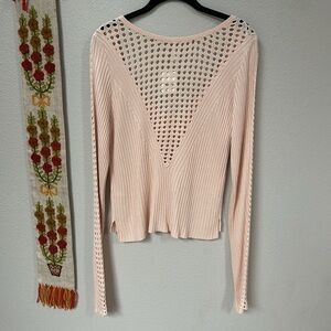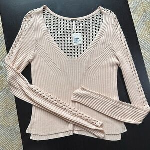 New with tags. Unique open weave on front, back, and down sleeves. Peachy pink shade. SZ S. Could possibly fit a medium as well. Please confirm measurements approximate laying flat in pictures as Poshmark does not honor returns for fit issues. Please see all 9 photos and one video provided. Thank you for looking.