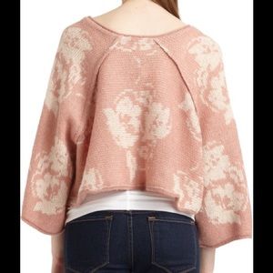 Mauve-ish/ light pink sweater with off white (floral?) pattern. Somewhat cropped so it will be shorter than you think if you're a busty gal like me. Still super cute! Not itchy at all-- 40% acrylic, 30% nylon, 20% wool, 15% alpaca.