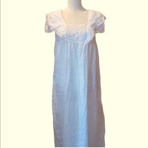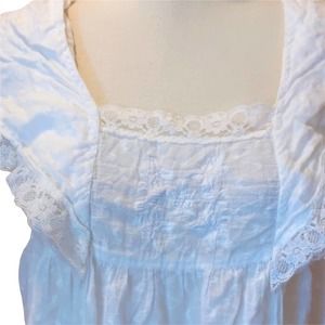 Square neckline with lace at the bodice. High waistline cuts through mid chest. Sleeves are ruffled with lace incorporated.