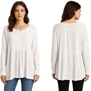 Free People Oversized Thermal Henley Waffle Knit Top Tunic White Long Sleeve Raw Hem -Cozy and relaxed Free People oversized henley-style tunic in soft waffle knit with raw hem. Features a scoop neckline, long sleeves, and a button-front placket with gathered seaming detail that drapes effortlessly. Perfect for layering or wearing solo with jeans or cutoffs. Waffle knit henley tunic top Button-front placket, gathered waist seam, flowy fit, long sleeves, lightweight knit Cotton blend73% viscose 24% polyester 3% elastane -pre-owned in excellent condition