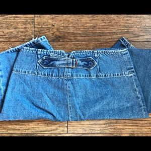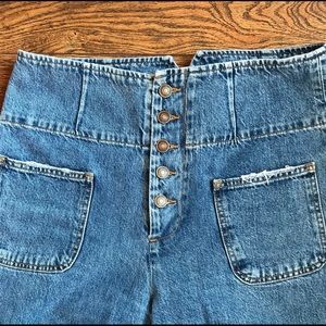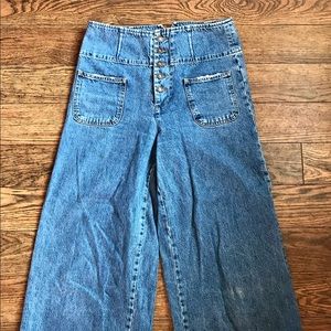 •Wide leg denim pants with back belt detail, button fly, & square front pockets.