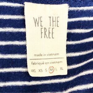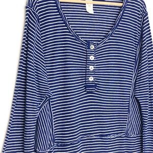 Free people with a free, navy, blue, striped oversize Henley with raw edge detailing