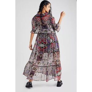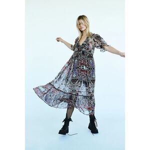 Perfectly printed in the idea maxi silhouette, this timeless dress features a ruffle-adorned V-neckline and bottom hem for added dimension.
