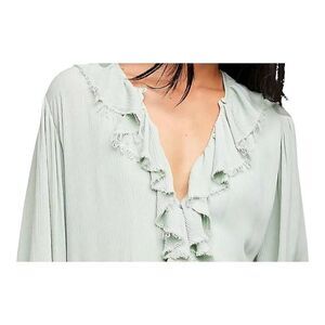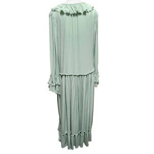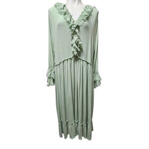 Free people Sweet Darlin Maxi Dress in minted jade. Can be worn with belt (not included). Button front with ruffle. Drawstring at cuffs