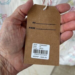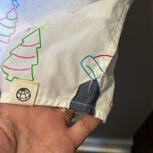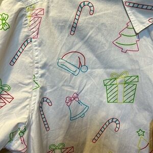 Free Planet Men’s Christmas Short Sleeve Button Down NWT. 100% cotton. White with Christmas Designs all over: candy canes, trees, bells, presents