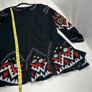 Sold as is‼️This stunning dress by Free the Roses showcases a black base adorned with intricate red embellishments, perfect for casual or resort wear. The A-line silhouette offers a flattering fit, while the long sleeves and crew neck add a touch of elegance. The dress is beautifully embellished, making it a standout piece for any occasion.