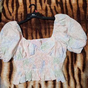 This multicolor blouse with short balloon sleeves and a cropped style is lightweight and stretchy, ideal for the spring and summer seasons.