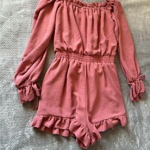 Off-shoulder romper with elasticized neckline and waist. Long sleeves with tie cuffs. Ruffle trim at hem and neckline. Lightweight textured fabric. Feminine and relaxed fit.