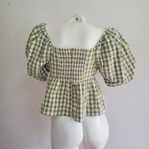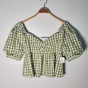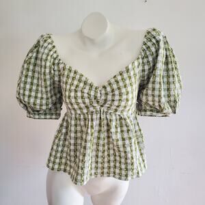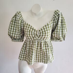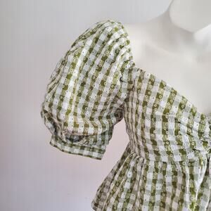 Free the Roses Gingham Check Blouse Small Olive Green Embroidered Eyelet NWT