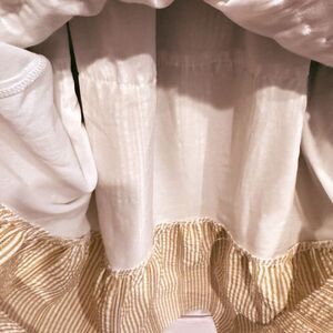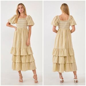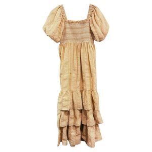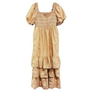 Free the Roses Maxi Dress Tan Striped Ruffle Tiered Puff Sleeve Size Small