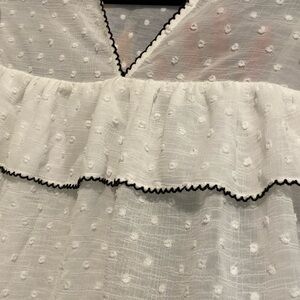 This charming white blouse features long sleeves and beautiful ruffled detailing along the neckline and chest, creating a soft and feminine look. The loose, flowy fit adds to its romantic style, making it a perfect choice for various occasions.