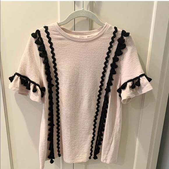Short sleeve comfy top with black embellishment.