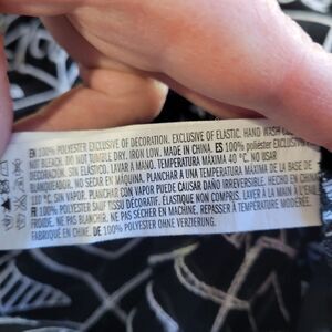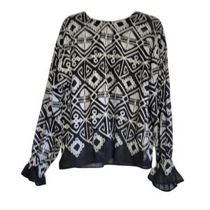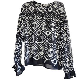 Free the Roses black sheer long sleeve with white geometric embroidered pattern round neck gathered ruffled sleeve single back button 46" bust 26" long