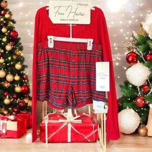 Free w/ Purchase 2 Piece by Free Haven Pajamas Henley & Shorts Plaid Flannel Red