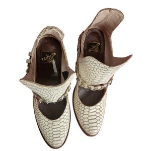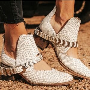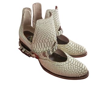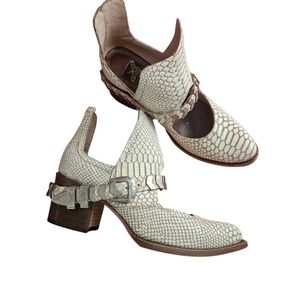 FreeBird Blade white snake booties. Pull on. Small Heel.