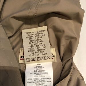 Versatile well made jacket. Reversible. Hooded. Fleece on white side. Zipper and snap closure on tan side. Pockets snap on tan side. Slit pockets on white side.