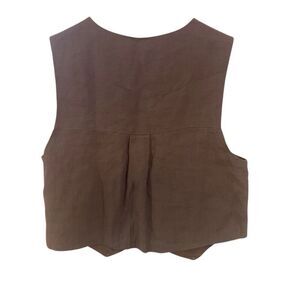 Embrace effortless style with this Free People button-up shell vest crafted from breathable 100% linen in a warm tan hue. The lightweight, sleeveless design is perfect for layering and adds a touch of festivalcore and boho chic to any outfit. Size 2 fits true to small.
