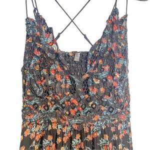 Features: sleeveless, fitted lace bodice, adjustable spaghetti straps, shark bite style hem, mini length, black floral