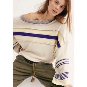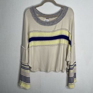 Free People Baggy Top Striped Womens Medium Oatmeal Beige Bell Sleeves Boxy Boho