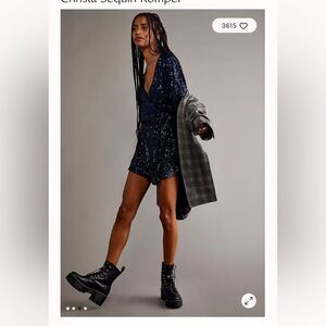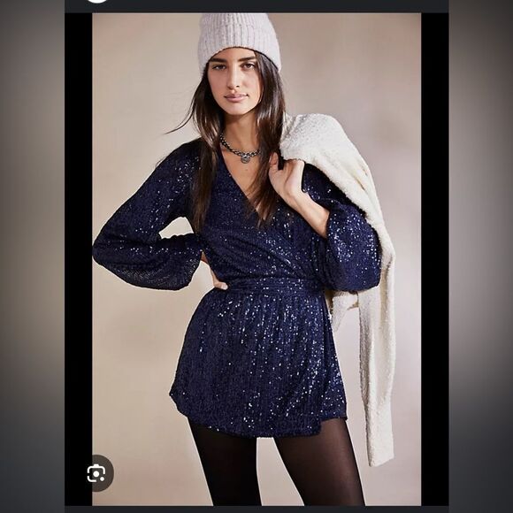 Free People Beaded Sequin Shorts Christa Long Sleeve Romper, Size Medium, Navy, NWT